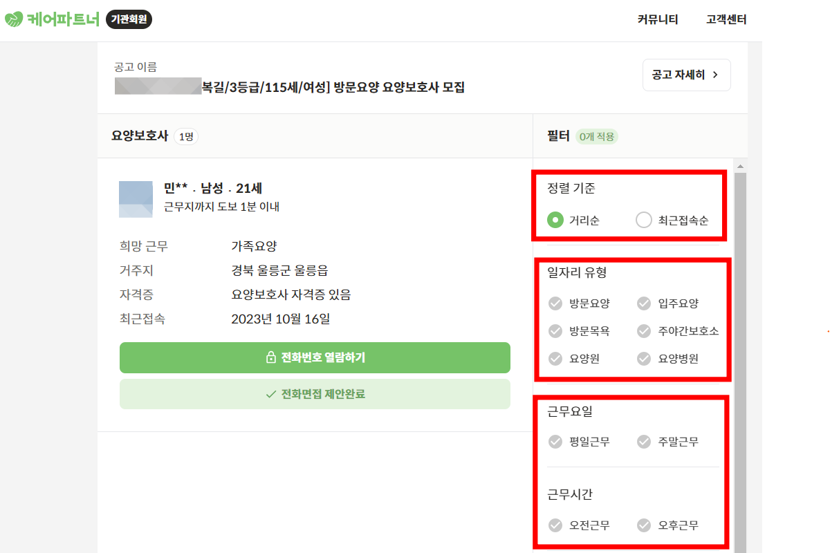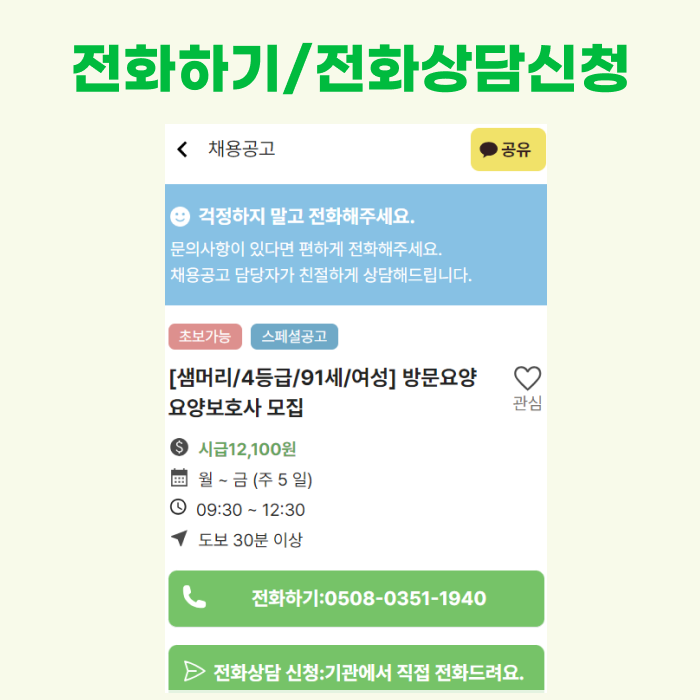 2. 케어파트너에 상단 노출된 채용공고를 보고 요양보호사 선생님들의 연락을 받게 됩니다.